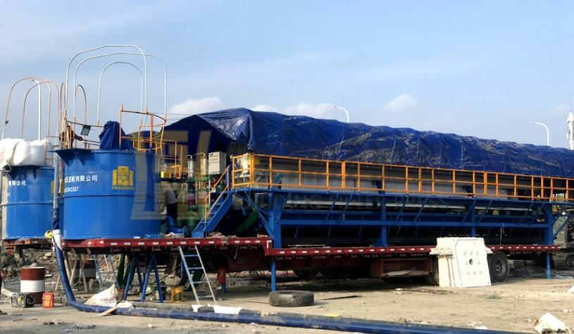 該機型由壓濾機,皮帶輸送機、入料泵、混合攪拌罐、操作平臺、雨棚等組成,泥漿在混合攪拌罐中與石灰或絮凝劑混合后由入料泵輸送至壓濾機內,在專用濾布的作用下對泥漿進行分離,形成泥餅和清水。
